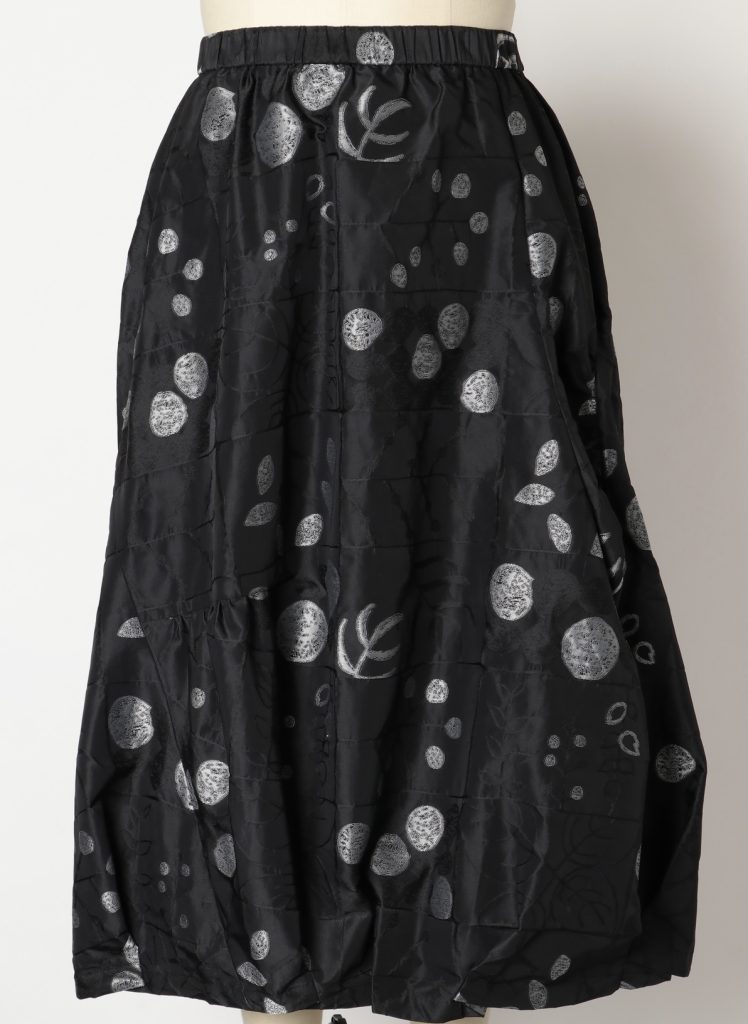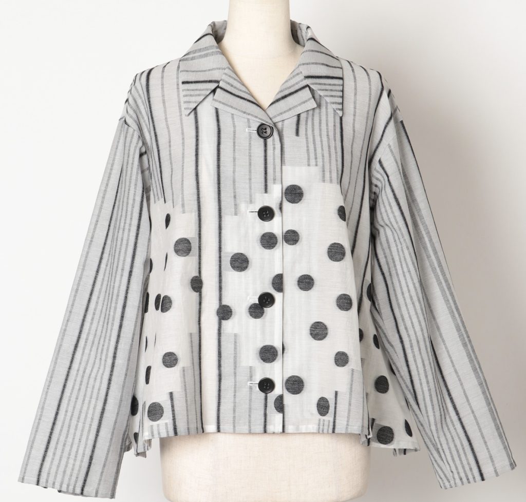 テーラードカラーをアレンジしたドットとストライプ柄ハオリとバルーンシルエットのスカート。