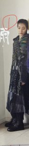 落ち着きのあるビッグチェック柄を縮絨加工でふっくらと仕上げたドレスに、色違いの2本のストールをレイヤードしたアーティーなスタイル。同素材のストールを二重に巻くことで、重なり合う色のコントラストが奥行きある表情をプラス。造形的なシルエットが慈雨らしいアート性を放ちます。