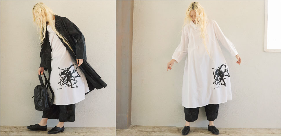 直線的でモード感のあるフォルムを描くコットンナイロン素材のコートに、大胆なフラワープリントを施したドレスを重ね、モードな装いに柔らかな表情をプラス。