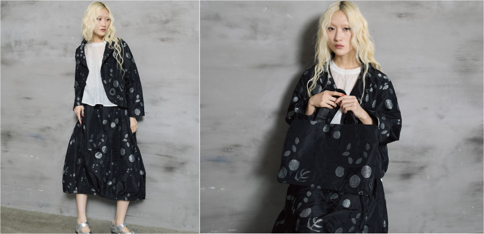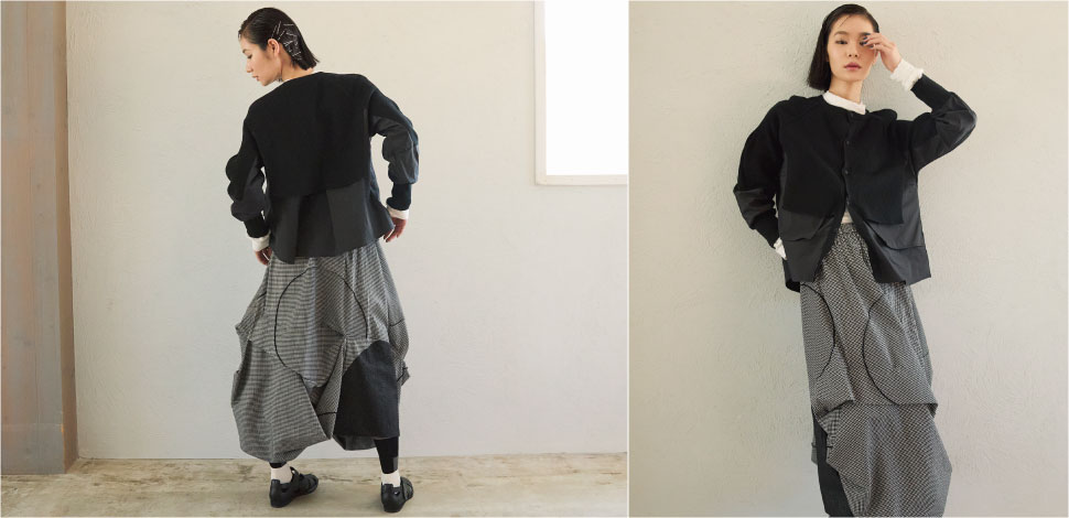 丸モチーフと丸みを帯びたシルエットのスカートを合わせ、柔らかさとモード感が共存するレイヤードに。