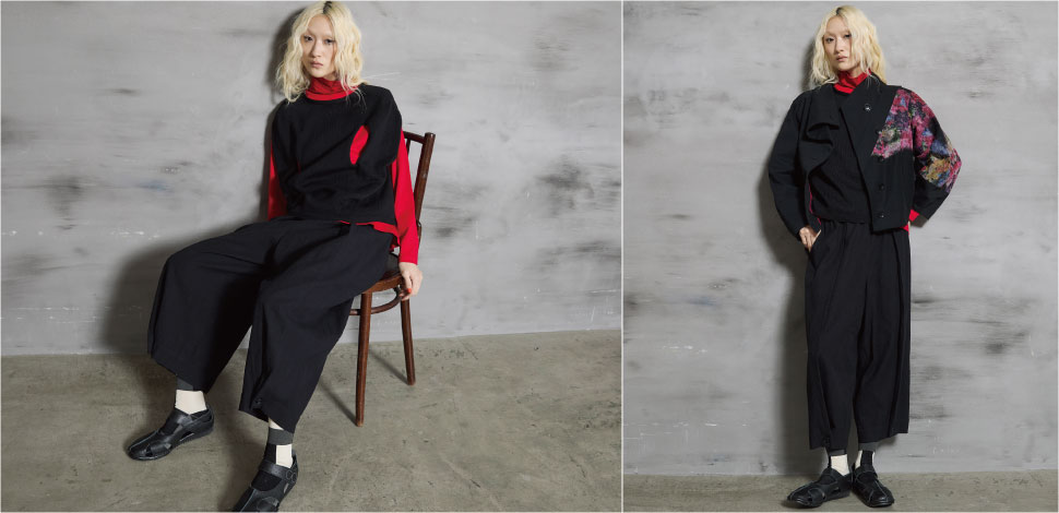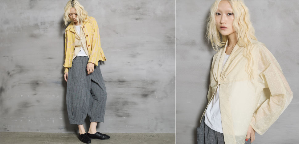 パンツは花柄のジャカード織りを施した和紙混コットン素材で、軽さとドライな質感が特徴。