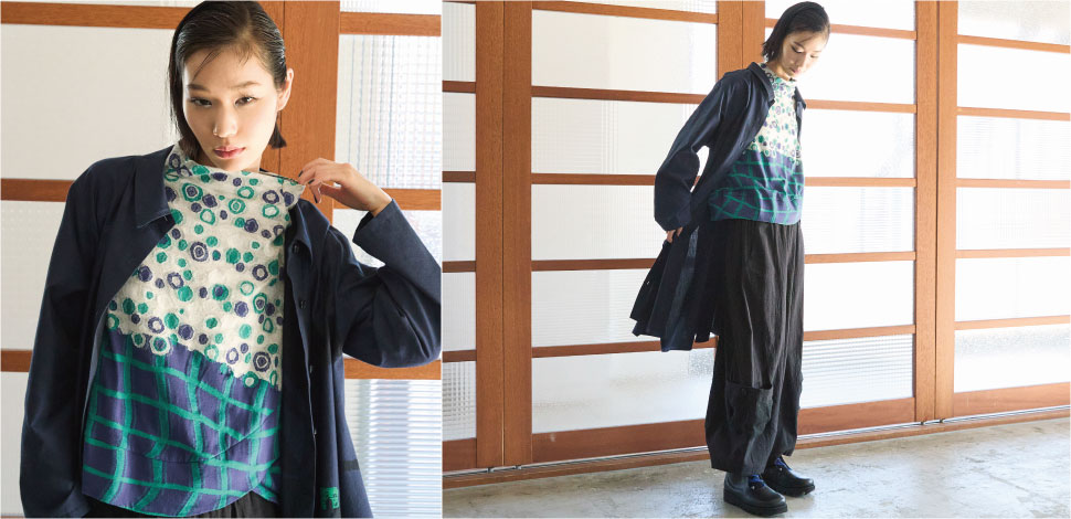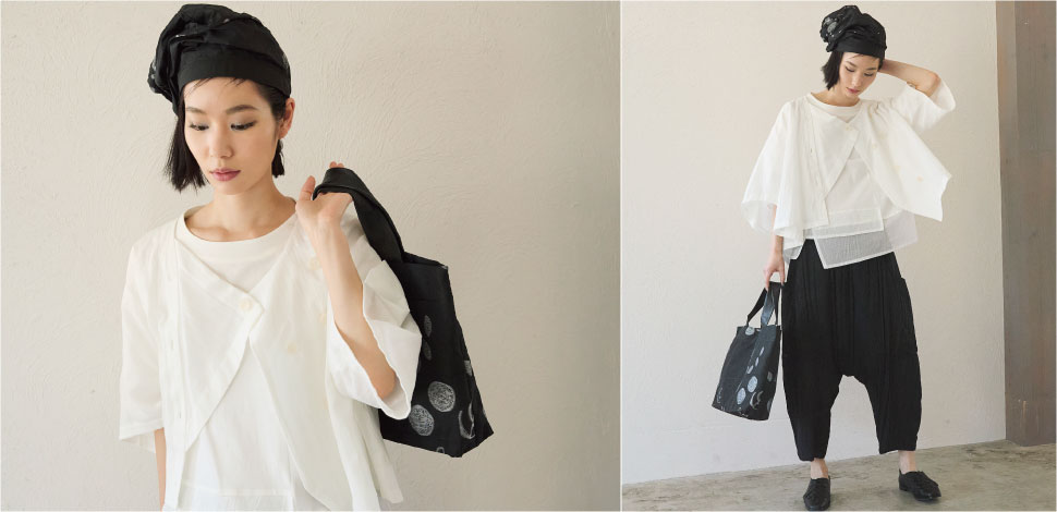 Pariの凱旋門やエッフェル塔を小さく織り込んだ遊び心のあるロングブラウスと、裾に麻のメッシュポケットを配したパンツを合わせ、インナーの存在感を引き立てています。