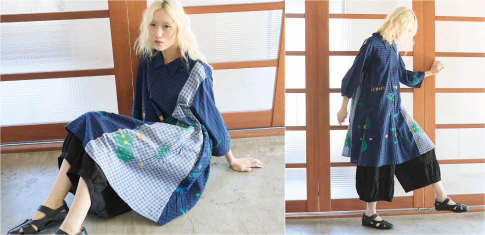 清涼感のあるギンガムチェック柄を縦ラインに配し、ポップな柄をジャカード織りで散りばめた、遊び心あふれるチュニックドレスが主役。