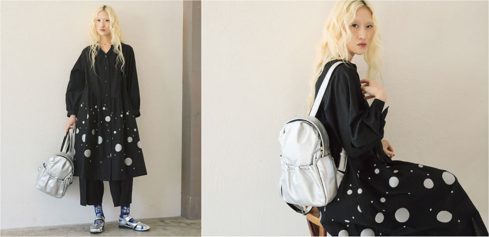 大小さまざまなドット柄が散りばめられたロングドレスは、前を留めて着るだけでなく、ハオリモノとして軽くはおることでスタイリングに変化をつけられる優秀アイテム。
