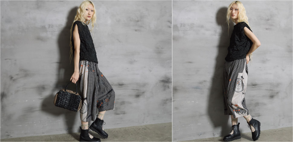 清涼感のあるギンガムチェック柄に、手描きのようなポップな柄をジャカード織りで重ねたオリジナリティのある生地を、サルエルパンツで表現。