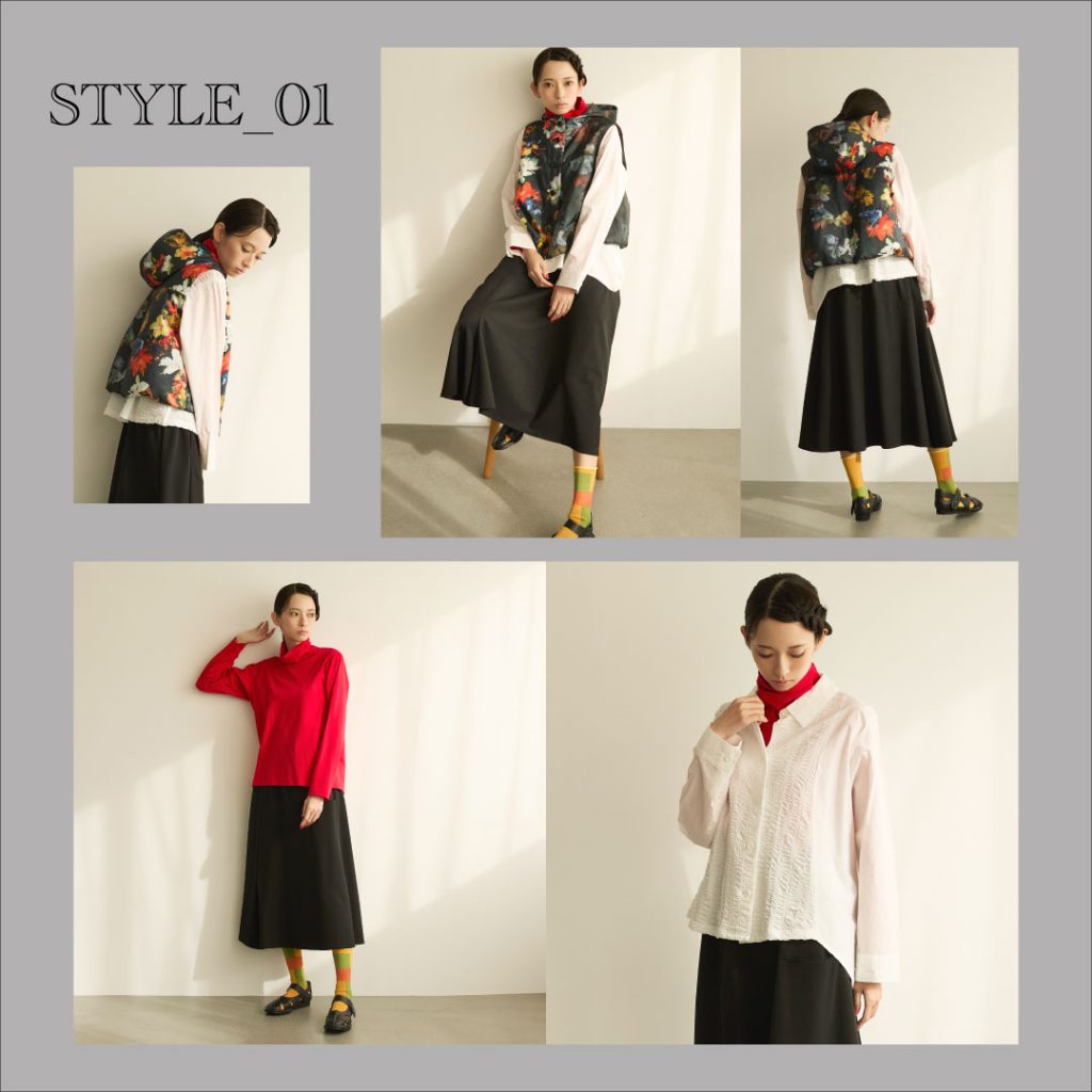 花柄をボンディングで立体化したベストを主役に、タックで陰影をつくるトップスを重ねるモノトーンコーデ。異なる質感を重ねながらも輪郭はすっきりと整う。素材のコントラストが静かな強さを生みます。