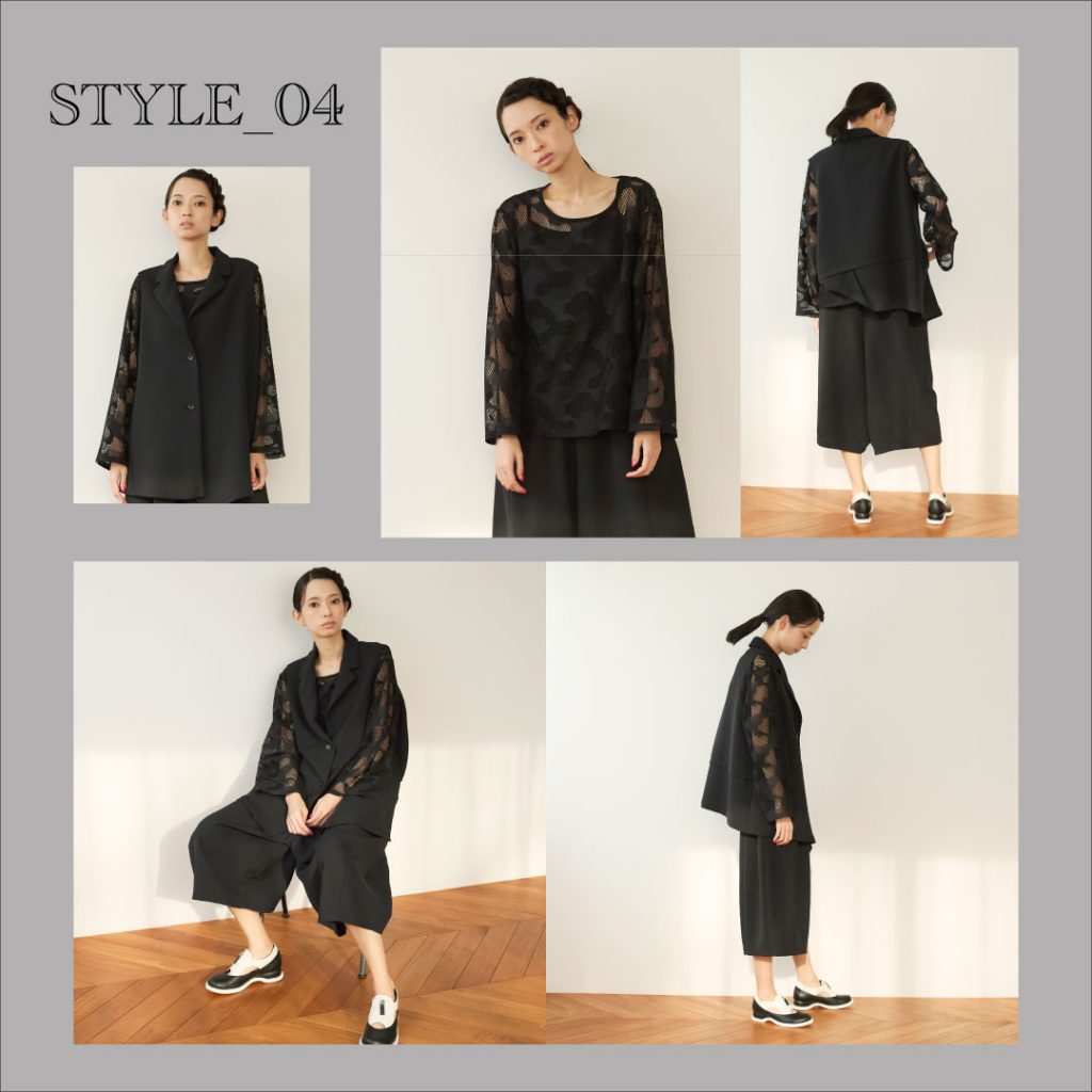 絵画のようなフラワープリントや立体的なフォルムをすっきりとしたラインに掛け合わせ、陰影で魅せるモノトーンへ。軽さと構築性を同時に備えた「JIU」ならではの春スタイル。