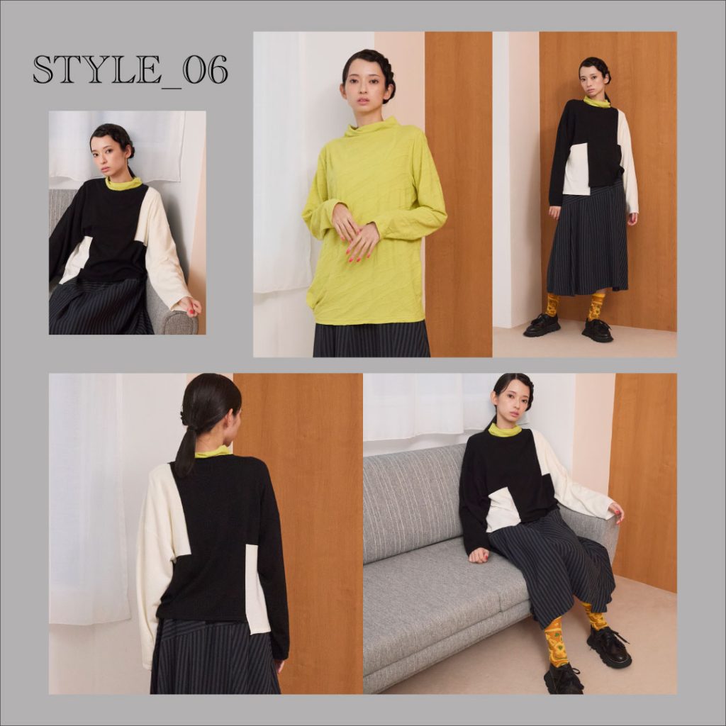 セーターの黒と白のコントラストに、プルオーバーのイエローが軽やかなアクセントを添える。凹凸のあるジャカードとストライプの縦線が重なり、3色で構成されたバランスを整えている。