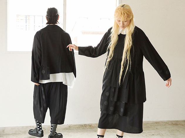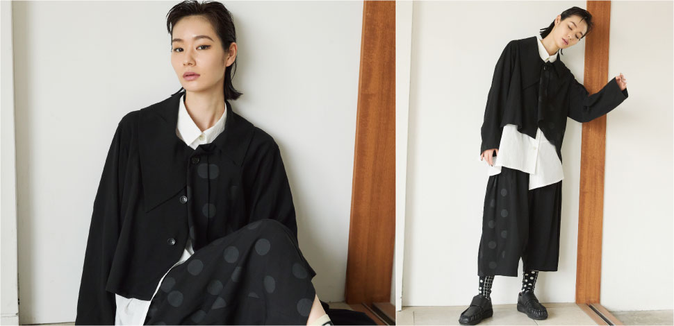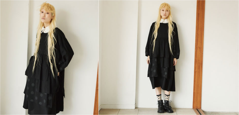 アシンメトリーの重ねの表情と、ギャザーによる流れるシルエットが奥行きを生み、エレガンスとモードが響き合う存在感あるドレススタイル。リズミカルに散りばめた大きめのドットが目を惹きます。