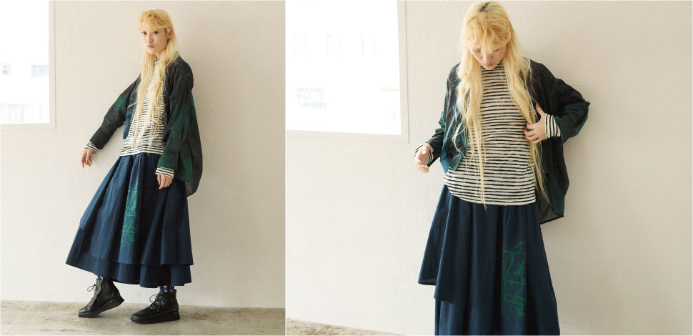 ボーダー柄が軽快な印象のプルオーバーに、深みのある色合いのマーブル模様をインクジェットプリントで施したハオリを重ね、日常の中にアートを感じさせる慈雨らしい洗練されたスタイル。